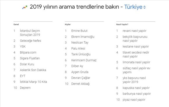 jpg #87110 · 23.12.2019 13:29 ~ Google'ın açıkladığı "Yılın Arama Trendleri 2019" listesine göre 2019 yılında Türkiye'de Genel kategoride en çok İstanbul Seçim Sonuçları 2019 arandı.şu adresten bakabilirsiniz. tık tık [ebkz]87110[/ebkz]