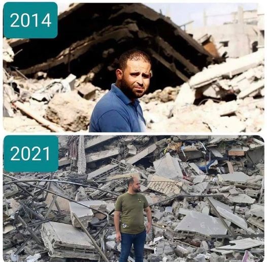 ccc #91934 · 18.05.2021 01:32 Yedi yıl sonra yine aynı yıkım.Gazzeli gazeteci Alâ Şemmâle, 2014 ve 2021'de İsrail tarafından yıkılan evlerinin önünde... Birincisi bombalanınca, büyük sıkıntılarla ikinci bir ev daha inşa etmiş, ama... [ebkz]91934[/ebkz]