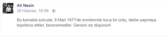 Ali Nesin'i de delirttiler. Bi şey değil Matematik köyüne yazık olacak! Ali Nesin bilmez mi Kemalistler sola yatan faşistler darbeye aşıktır. Her türlüsüne... Fetöcüsü dahil... 15 temmuz darbesine ilk geceki destekleri ve sabahında 'vah Mehmetçiğe bu yapılır mı ağıtları..' Şimdi de aynı mihvalde Yürüyorlar...