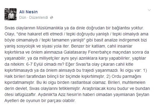 Madımak vakası hakkında müslümanlıkla ya da dinle doğrudan bağlantısı olmadığını belirtmişti. Babası ali nesin'in madımak'ta linç ve yangından ölmek arasında tercih yapmak üzereyken son anda kurtulduğunu hatırlatalım.