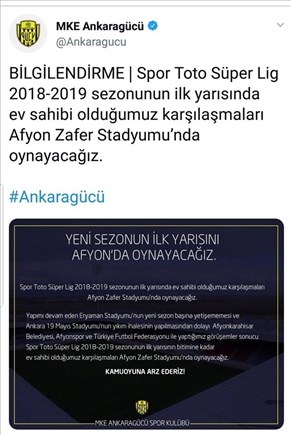 Türkiyenin Başkentinin Tek Süperlig Takımı Ankaragücü'ne Ankara'da oynayacağı stadyum bulunamadı ! Sezonun ilk yarısını Afyon'da oynayacağı söyleniyor YAKIŞIYOR MU Türkiyem. Demek ki neymiş,takımı iktidara yamamak ve siyasete alet etmemek lazımmış..