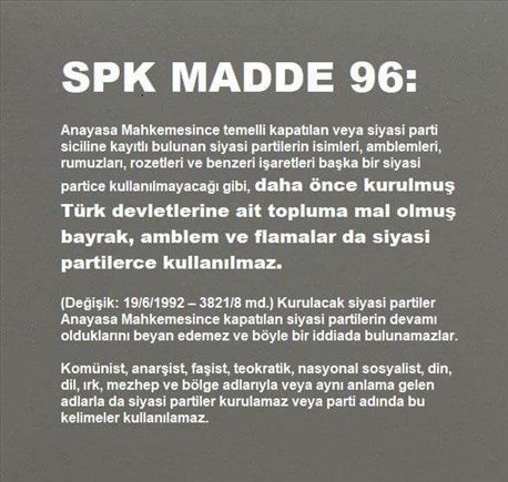 “Anayasa Mahkemesince temelli kapatılan veya siyasi parti siciline kayıtlı bulunan siyasi partilerin isimleri, amblemleri, rumuzları, rozetleri ve benzeri işaretleri aynen veya iltibasa mahal verecek şekilde başka bir siyasi partice kullanılmayacağı gibi, daha önce kurulmuş Türk devletlerine ait topluma mal olmuş bayrak, amblem ve flamalar da siyasi partilerce kullanılmaz