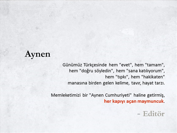 şu sıralar revaşta olan, moda olan, trend olan neyse adı bir kelime. Hemen hemen herkesin ağzından duymaya başladım. Kelimenin bu kadar sık kullanılmasından rahatsız olsam da güzel be. Aynen.