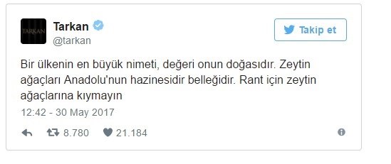 Bir ülkenin en büyük nimeti, değeri onun doğasıdır. Zeytin ağaçları Anadolu'nun hazinesidir belleğidir. Rant için zeytin ağaçlarına kıymayın. Tarkan.