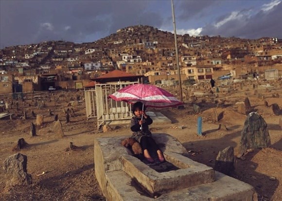 (mezarlığın bir köşesinde, mayınlara basarak ya da bir atış sırasında ölen çocuklara bakarken/kendisini ölümden bir şemsiye ile korumaya çalışan kız çocuğu beliriyor fotoğrafın içinde...)