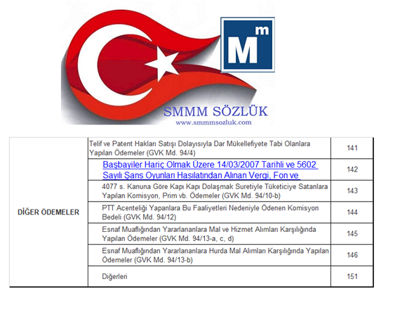 Başbayiler Hariç Olmak Üzere 14/03/2007 Tarihli ve 5602 Sayılı Şans Oyunları Hasılatından Alınan Vergi, Fon ve Payların Düzenlenmesi Hakkında Kanunda Tanımlanan Şans Oyunlarına İlişkin Olarak; Bilet, Kupon ve benzerlerini Satanlara, Düzenlenen Her Türlü Bahis ve Şans Oyunlarının Oynatılmasına Aracılık Edenlere, Diğer Kişilerce Çıkartılan Bu Nitelikteki Biletleri Satanlara Yapılan Komisyon, Prim ve Benzeri Ödemelerden (GVK Md. 94/10-a) (KVK Md. 15/1-g) 142