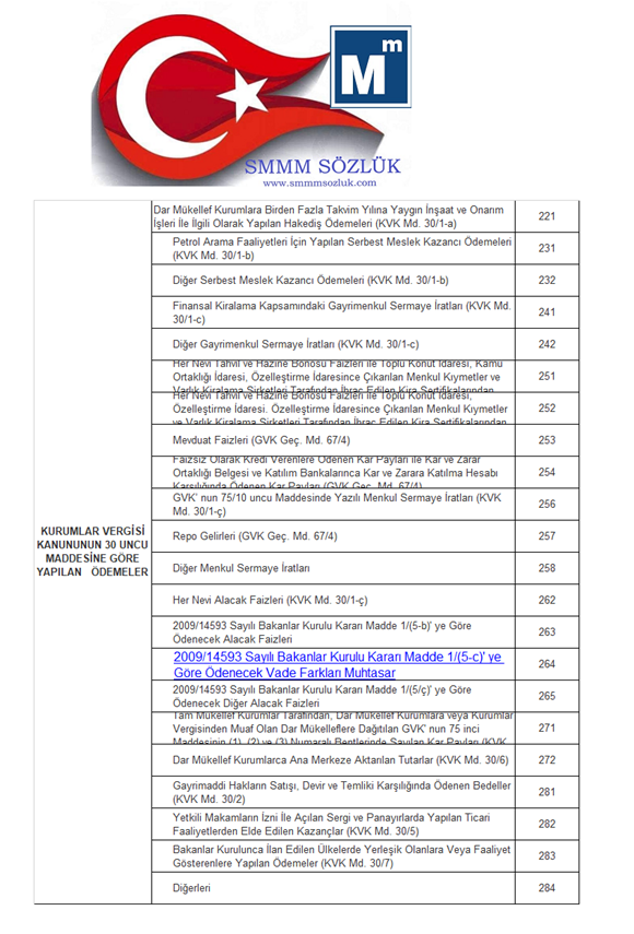 2009/14593 Sayılı Bakanlar Kurulu Kararı Madde 1/(5-c)' ye Göre Ödenecek Vade Farkları Muhtasar 264