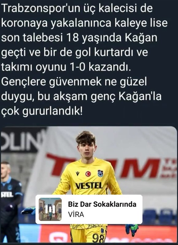Trabzonspor'un üç kalecisi de koronaya yakalanınca kaleye lise son talebesi 18 yaşında Kağan geçti ve bir de gol kurtardı ve takımı oyunu 1-0 kazandı. Gençlere güvenmek ne güzel duygu, bu akşam genç Kağan'la çok gururlandık!