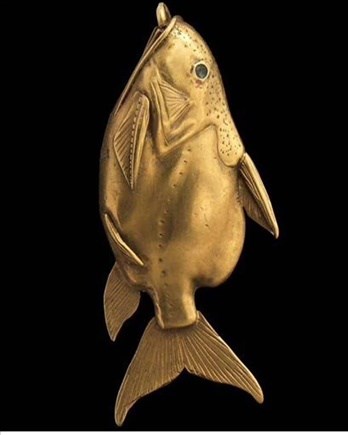 1.6 cm yüksekliğinde. Bu kolye, düzenli olarak yukarı doğru kayan ve dolayısıyla ölü balıklara benzeyen bir tür olan "baş aşağı yayın balığı" şeklini alır. Antik Mısırlılar belki de bu tür yayın balıklarını yeniden doğma güçleriyle ilişkilendirdiler. Bu görkemli örnek, bir çocuğun tabutunda, muhtemelen bir kuşak için yapılmış diğer dört balık formlu kolye ucu ve gümüşten deniz ile birlikte bulunmuştur.