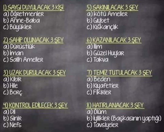 Ey oğlum, arkadaşlık yaptığın, ziyâretine gittiğin kimse, iyi ahlâk sahibi olsun, kötü ahlâkı olanlarla arkadaşlık etme, onlarla görüşme! Çünkü onlar, suyu olmayan çöl, dalları yeşermeyen ağaç, ot bitmeyen topraktırlar.