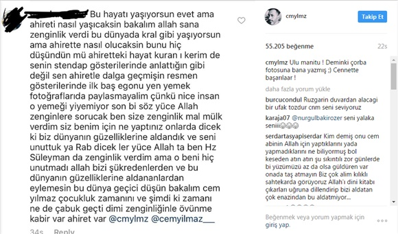 cem yılmaz'ın instagram'da paylaştığı br altına "yaşıyorum şu hayatı be" bol pul biberli çorba fotosuna içerleyen birinin yazdığı ilginç yorum.