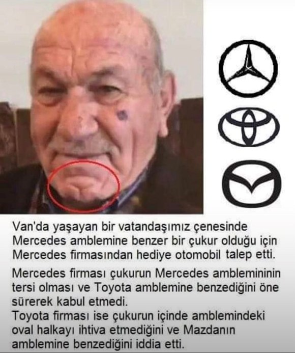 Van'da yaşayan bir vatandaşımız çenesinde Mercedes amblemine benzer bir çukur olduğu için Mercedes firmasından hediye otomobil talep etti.