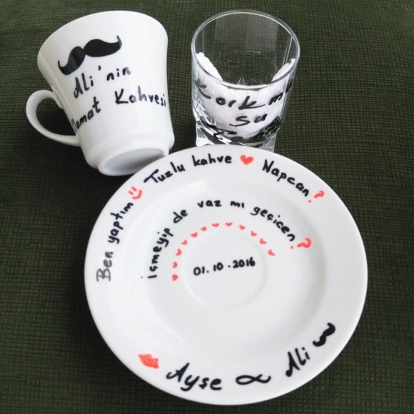 Damat beyin tuzlu kahvesi yanlışlıkla başka misafirlere gitmesin, hem de o günden bi anı olarak kalsın diye düşünülerek hazırlanmış yeni nesil fincanlardır.