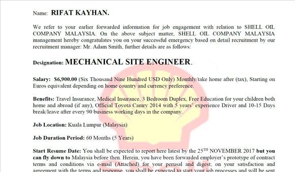 en makine mühendisi bir arkadaşa iş teklifi sırasında çeşitli yollardan para istemişler, son anda fark edip 895 dolar vermekten kurtulmuş.