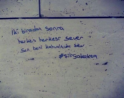 Bazı insanlar için büyük bir zevk halini almış durumdadır. Bir duvar gördüğünde ohhh mis gibi duvar deyip duvara özlü söz, kendi içinden geçen güzel bir söz, bir dert bir tasa ve ya anlamsız birşeyler karalama şeklinde oluşmuştur. #şiirsokakta etiketi ile birlikte bu yazılara sıklıkla denk gelebilirsiniz. Örneğin ''Kaç şeker atarsan at yalnız içiyorsan acıdır''
