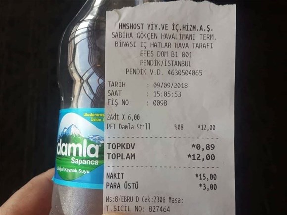 Sabiha Gökçen Havalimanı; 2 adet 0.5 L su 12 TL... Normalde çok pahalı bu. Ama bunu da "Ya kardeşim orası havalimanı. Her zaman pahalı idi zaten. Adamlar ne kiralar veriyorlar vs" tarzı savunan kraldan çok kralcılar hep oluyor. Kim ne derse desin bu su 6 lira etmez.