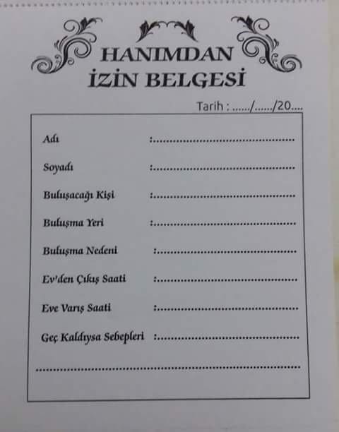 evlilerin akşam dışarı çıkması için doldurması gereken belge. Önceklikle dilekçe hazırlanır dilekçesi olmayan aşağıdaki matbu formu doldurup imzalar. İmzaladıktan sonra hanıma sunar. Belli bir bekleyişten sonra hanım bunu onaylar yada reddeder.