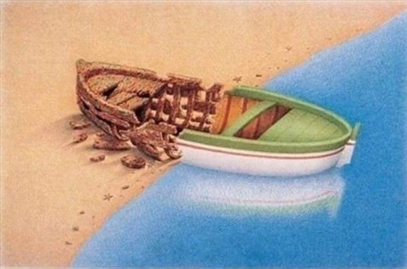 Burada iki anlam var. Bir bölümü kırılmışlığı, dökülmüşlüğü ve karaya vurmuşluğu anlatıyor insanın yaşanmışlığıyla ilgili. Diğer bölüm ise sadeliği, huzuru ve bütünlüğü (izdüşümüyle) mavinin ve yeşilin bir arada olduğu DİNGİN bir yaşamı anlatıyor. Ve gerçekten her şey ve benzer şekilde herkes (İNSAN) ait olduğu yerde hayat bulur. Dolayısıyla HERKES, tercihleri doğrultusunda layık olduğu biçimde yaşar. Mutlu veya mutsuz. ÖZET olarak...