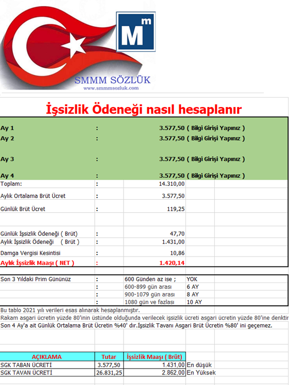 Hesaplanan İşsizlik Ödeneği : 3577,50 TL X 40 /100 = 1431 TL.- Aylık Brüt Maaş