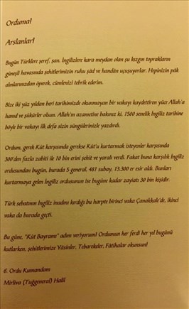 Halil paşa kutü'l amare zaferinden sonra 6. orduya hitaben şu mesajı yayınlamıştır.