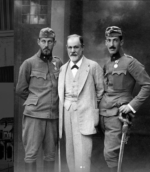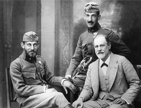 1914 - Sigmund Freud I. Dünya Savaşı'ında Avusturya-Macaristan ordusunda görev yapan oğullarıyla beraber. Soldaki Ernst L. Freud(mimar), sağdaki martin Freud (yazar)