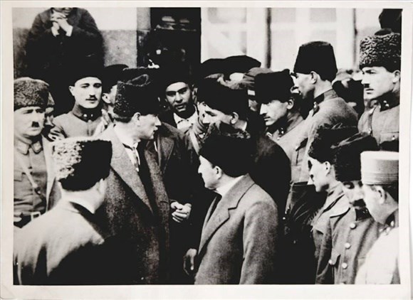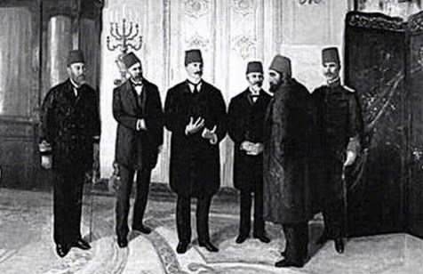 Takvim yaprağının en üstünde Hicrî ayların 5.si olan '' Cemaziyelâhir 3 ''yazıyor...Solunda imsak,dakika ve saati,sağında tulû-ı şems (güneşin doğuşu)saati ve dakikası,fotoğrafın sağında ''efrenci''yani Fransızca tarihi 1913,solunda hicri 1329...Fotoğrafın altında ''Sultan Mehmed Han-ı Hamse(Sultan 5. Mahmet Reşad) Hazretleri'nin Kılıç Alayı 1325...En altta büyük yazıyla ''Cumartesi'' yazıyor...Aslında Sultan Reşad'ın kılıç kuşanma ve Cülûs yani tahta çıkma töreni 1909 yılında Eyüpsultan Camii'nde Eyüpsultan Hz.nin türbesi başında dualarla yapılmıştır...Haliç'ten deniz yoluyla gelen padişah Bostan İskelesi'nden karaya çıkmış,bir kahve içimi Bostan İskelesi Kahvesinde dinlendikten sonra yürüyerek türbeye gelmiş,Cülûs ve kılıç Kuşanma Töreni'nden sonra Edirnekapı-Fatih-Sultanahmet-Köprü yoluyla Dolmabahçe Sarayı'na dönmüş...Yukarıdaki fotoğrafta görünen tak Şişli Âbide-i Hürriyet Caddesi'nin üstünde kurulmuş İttihat ve Teraki liderleri tarafından...Sağda İttihat ve Terakki liderlerinden ve sarayın damadı da olan Enver Paşa Aşağıda o törene gidiş sahnesinde beyaz cübbesi görünen şeyhülislam'ın yanındaki şişmanca zât Sultan 5. Mehmet Reşat'tır...