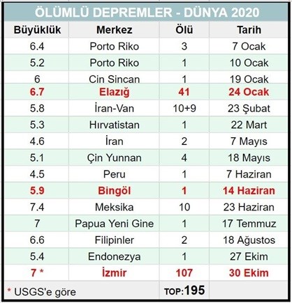 2020 yılında Dünyada meydana gelen depremler ve kaybedilen insan sayısı.
