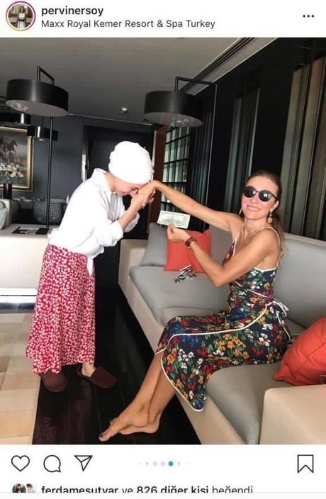 Sevgili arkadaşlar mesajlarımın özellikle dini değerleri güçlü olan insanlara ulaşmasını istiyorum. Ellerini vicdanlarına koyup tekrar tekrar düşünmeye davet ediyorum. Bakın aşağıda paylaştığım fotoğraf Turizm bakanının eşi Pelin hanım.. Evinde çalışan işçilere elini öptürerek 100 dolar verirken fotoğraf çektiriyor ve instagram hesabında paylaşıyor. Burada en can yakıcı nokta değerlerimizle, irfan-i geleneklerimizle alay edilmesi. Bizlerin düsturunda Hz. Muhammed'in buyurduğu gibi, "Bir elin verdiğini diğeri görmeyecek" sözü meşrudur. Yani öyle ki bir garibana yardımcı olurken bile utanıyor, gözünün içine bakamıyoruz ama bu insanlar bunun fotoğrafını çekiyor ve kamuya açık alanda toplum değerlerini rencide ediyor.