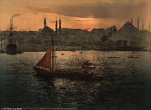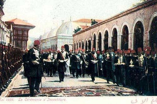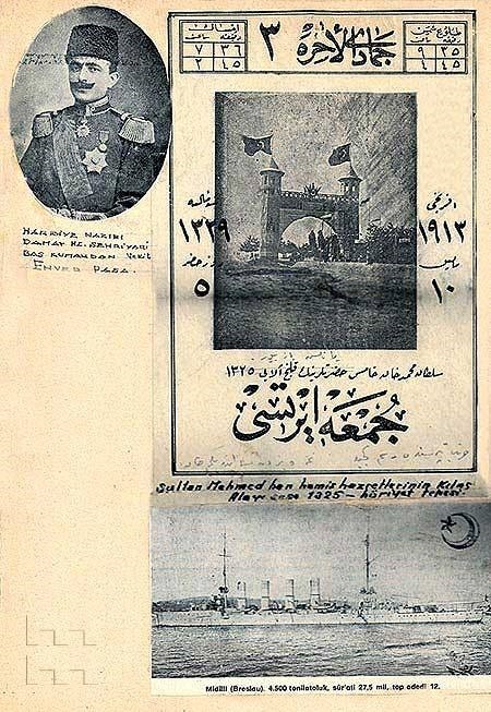 Takvim yaprağının en üstünde Hicrî ayların 5.si olan '' Cemaziyelâhir 3 ''yazıyor...Solunda imsak,dakika ve saati,sağında tulû-ı şems (güneşin doğuşu)saati ve dakikası,fotoğrafın sağında ''efrenci''yani Fransızca tarihi 1913,solunda hicri 1329...Fotoğrafın altında ''Sultan Mehmed Han-ı Hamse(Sultan 5. Mahmet Reşad) Hazretleri'nin Kılıç Alayı 1325...En altta büyük yazıyla ''Cumartesi'' yazıyor...Aslında Sultan Reşad'ın kılıç kuşanma ve Cülûs yani tahta çıkma töreni 1909 yılında Eyüpsultan Camii'nde Eyüpsultan Hz.nin türbesi başında dualarla yapılmıştır...Haliç'ten deniz yoluyla gelen padişah Bostan İskelesi'nden karaya çıkmış,bir kahve içimi Bostan İskelesi Kahvesinde dinlendikten sonra yürüyerek türbeye gelmiş,Cülûs ve kılıç Kuşanma Töreni'nden sonra Edirnekapı-Fatih-Sultanahmet-Köprü yoluyla Dolmabahçe Sarayı'na dönmüş...Yukarıdaki fotoğrafta görünen tak Şişli Âbide-i Hürriyet Caddesi'nin üstünde kurulmuş İttihat ve Teraki liderleri tarafından...Sağda İttihat ve Terakki liderlerinden ve sarayın damadı da olan Enver Paşa Aşağıda o törene gidiş sahnesinde beyaz cübbesi görünen şeyhülislam'ın yanındaki şişmanca zât Sultan 5. Mehmet Reşat'tır...