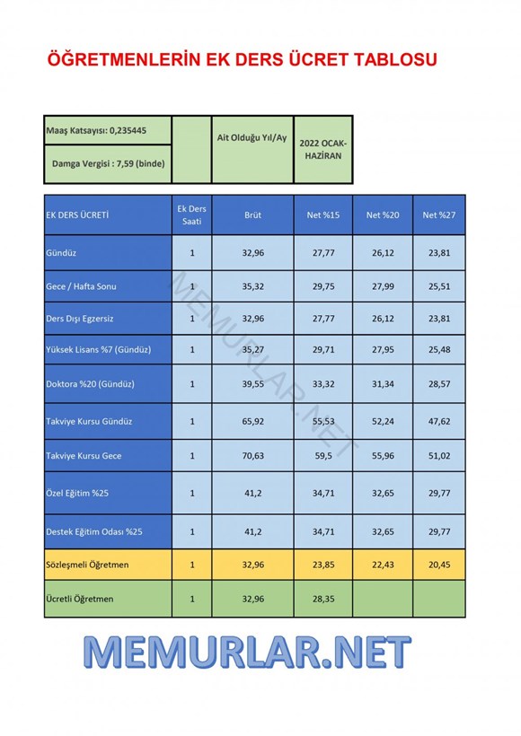 Bu verilere göre 2022 yılı birinci altı ayı için net ek ders ücretleri şu şekilde olacaktır;