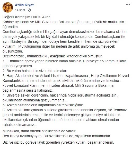 emekli koramiral atilla kıyat'ın yeni milli savunma bakanı hulusi akar'a gönderdiği mesajdır. çok derin anlamlar içerir.