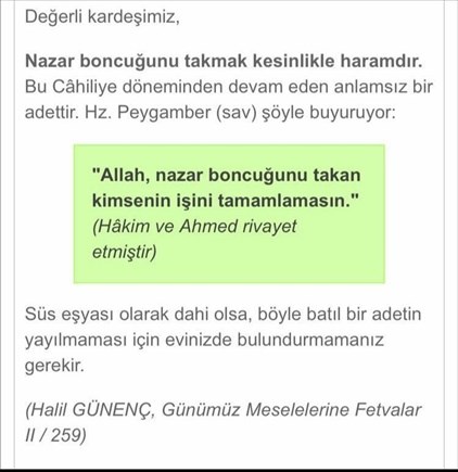 Çoğumuz için basit görülen bir konu nazar boncuğu. Ne alakası var, süs için alıyoruz, o niyette değiliz vs bahaneyle %60-70 müslümanın evinde bir şekilde bulunan bir şey. Evde işte arabada eşyada takılı olmasının hükmü başka olsa da bunun fetvasına inanmamak başka bir risk taşıyor.