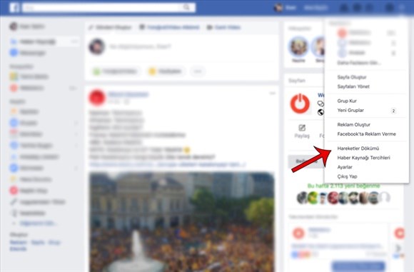 Öncelikle Facebook'a giriş yapın ve ana sayfanın hemen sağ üst köşesinde bulunan 'aşağı doğru ok' işaretine tıklayın. En alt kısımda 'Hareketler Dökümü' var, oraya bir tık yapın.