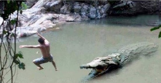 uzunca bir süre kimse atlamadı taa ki bir adam atlayana kadar. Suya atlayan adam önde timsahlar peşinde delice bir kovalamaca başladı. En sonunda güç bela adam sahile çıkmayı başardı.
