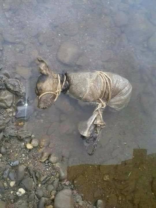 İnsandır..! Bağlanıp suya atılan bir köpek..Şu resmi gördüğümde insanlığımdan utandım..Kelimelerin boğazda düğümlendiği bir tablo..