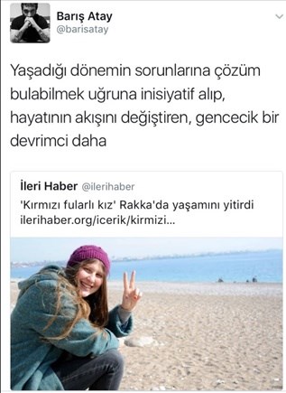 '' Kırmızı Fularlı Kız, Gezi'nin içimizi ısıtan en güzel gülüşlü meleği, Rakka önünde toprağa düşüp yıldızlara yükselerek içimizi yine yaktı. ''