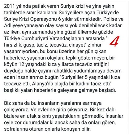 yalnız türkiye'nin, sınırlarını açarak gelenlerin insanca yaşaması için elinden geleni yapmaya çalışması -ki bahsi geçen olay bundan iki yıl önce 1500 suriyelinin yaşadığı ve çalıştığım kampta yaşanmıştır- bazıları tarafından suistimal edilmiş ve bu durum yetkililer tarafından görmezden gelinmiştir.