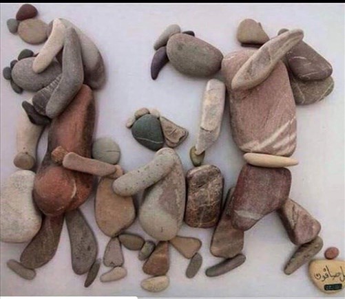 Bir mülteci, yaşadıklarını taşlarla anlatmış.Cümle kursak bu kadar güzel anlatamazdık. Kime ait belli değil. Sağ alt taşta imza var fakat çözmek lazım....
