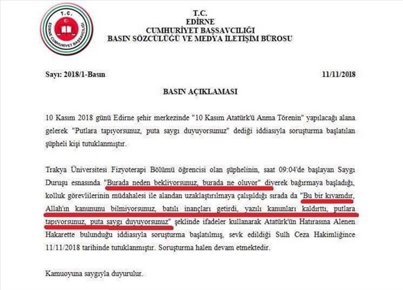 10 Kasım sabahı Edirne'de gözaltına alınan 21 yaşındaki Emine Şahin, Atatürk'e hakaret suçundan tutuklanıp cezaevine gönderilmiş.